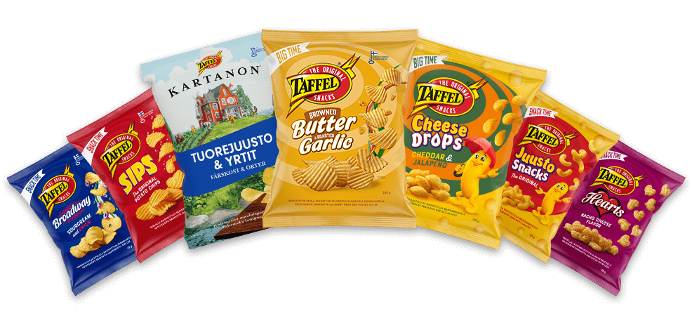 Rapeasta Taffel-valikoimasta löydät sipsit, linssisipsit, dipit, popcornit, juustonaksut, pähkinät ja muut herkulliset snacksit!