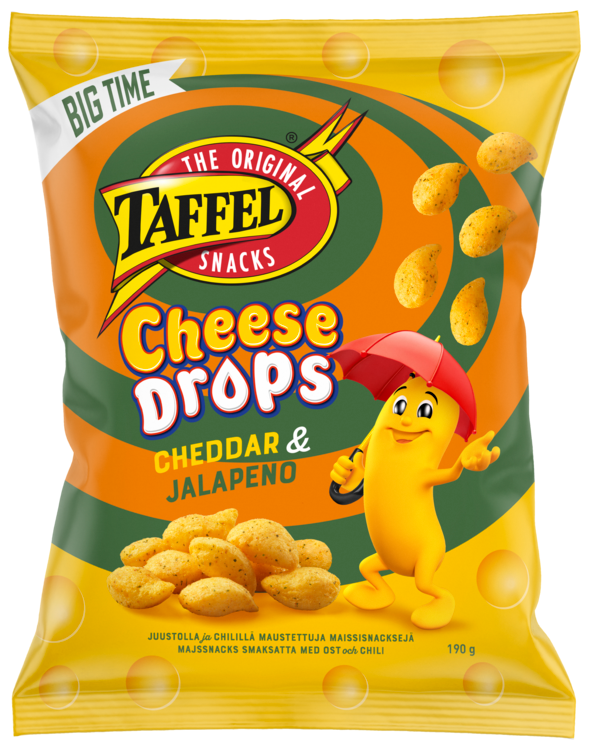 Taffel Cheese Drops Cheddar & Jalapeno – sataisipa näitä! Tämä pisaranmuotoinen juustonaksu yhdistää vastustamattoman cheddar-juuston täyteläisyyden ja jalapenon lempeän lämmön.